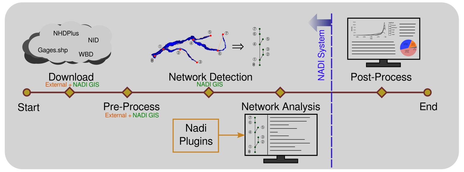 The main component of the NADI is the Domain Specific Language (DSL) called Nadi Task System. The custom syntax and data types used in the task system can help researchers run river based analysis easily and intuitively compared to other general purpose programming languages. A prerequisite to that is the network detection, NADI comes with a GIS tool to help with large networks while smaller networks can be manually entered in the system. The figure below shows a typical workflow while using NADI System.